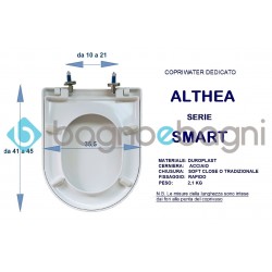 Copriwater dedicato a chiusura rallentata per sanitari SMART di ALTHEA. In materiale termoindurente avvolgente e con chiusura NORMALE O SOFT CLOSE