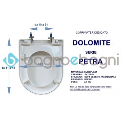 Copriwater dedicato a chiusura rallentata per sanitari PETRA di DOLOMITE. In materiale termoindurente avvolgente e con chiusura NORMALE O SOFT CLOSE