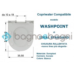 Copriwater Washpoint, marca Ideal Standard in materiale termoindurente avvolgente; in resina termoindurente avvolgente con cerniere cromate a chiusura rallentata soft close